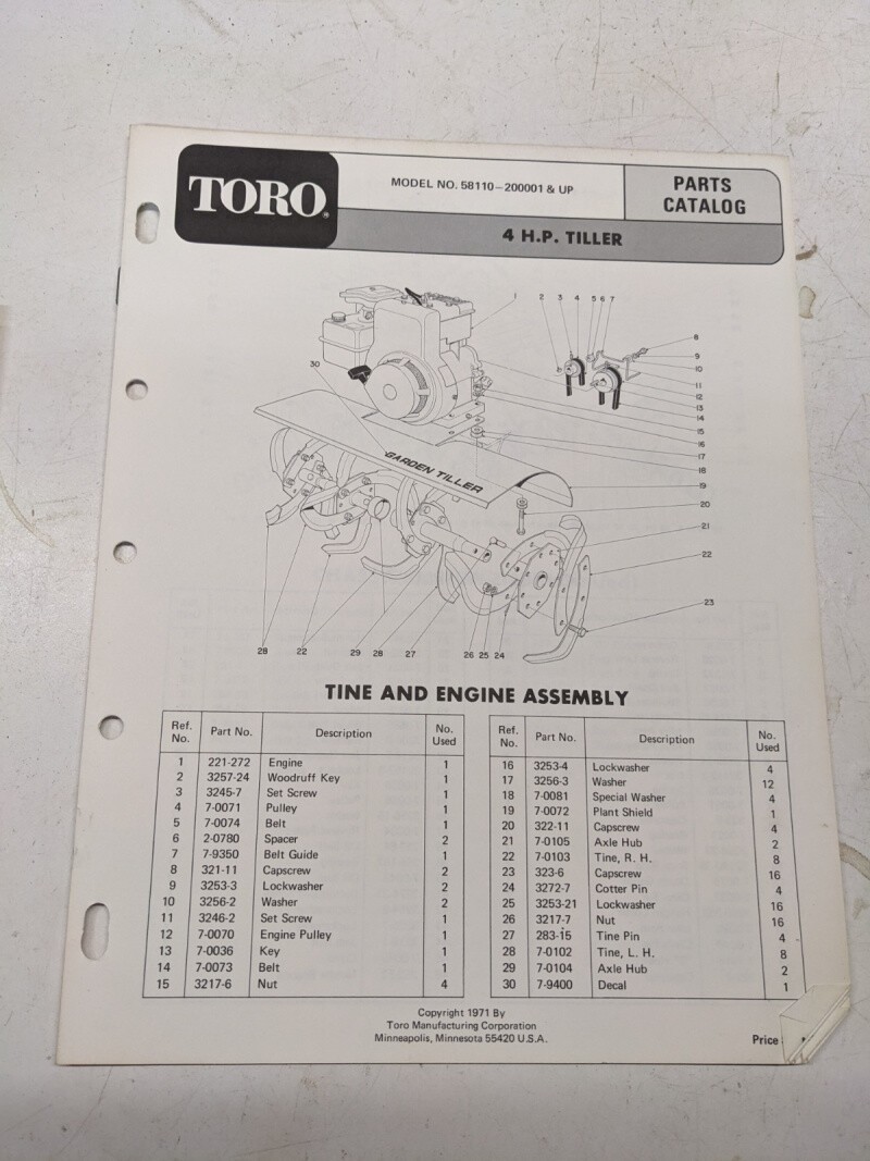 Toro Parts Catalog List Book Manual 4Hp Tiller 581100 1971 Garden Front Tine