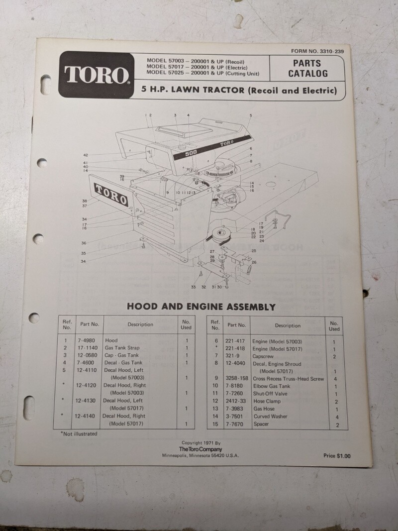 Toro Parts Catalog List Book Manual 5Hp Lawn Tractor 57003 57017 57025 1971