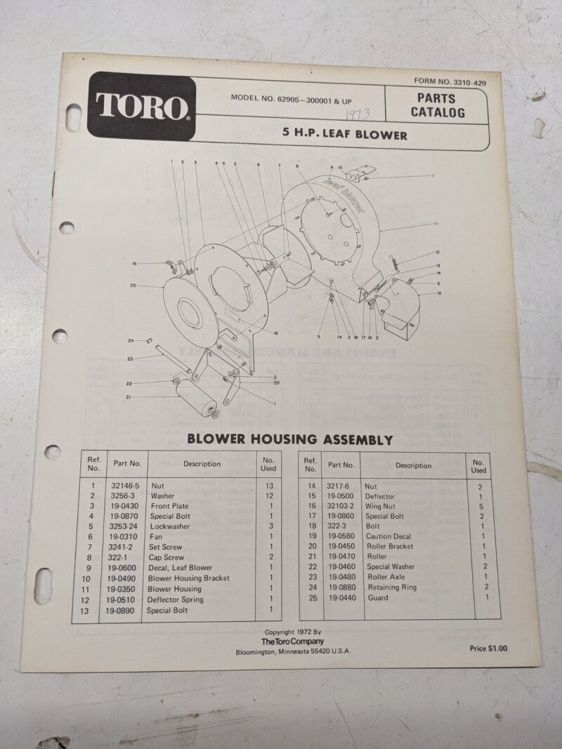 Toro Parts Catalog List Book Manual 5Hp Leaf Blower 62905 3310-429 1972