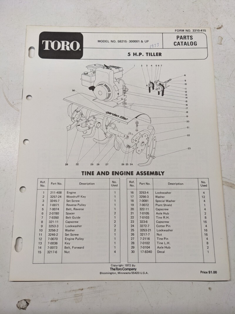 Toro Parts Catalog List Book Manual 5Hp Tiller 58215 3310-415 1972 Front Tine