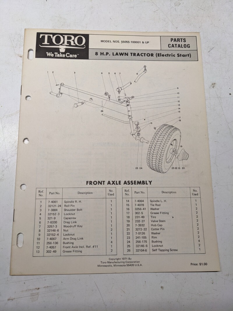 Toro Parts Catalog List Book Manual 8Hp Lawn Tractor 55055 1971 Electric Start