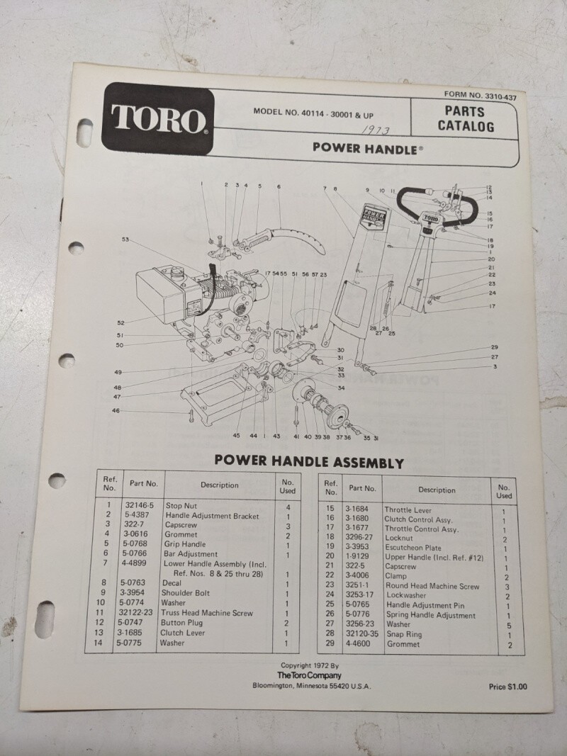 Toro Parts Catalog List Book Manual Power Handle 40114 30001+ 3310-437 1972