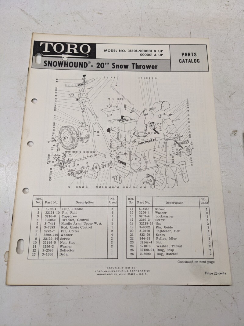 Toro Parts Catalog List Book Manual Snow Hound 20” 31301 1968 Blower