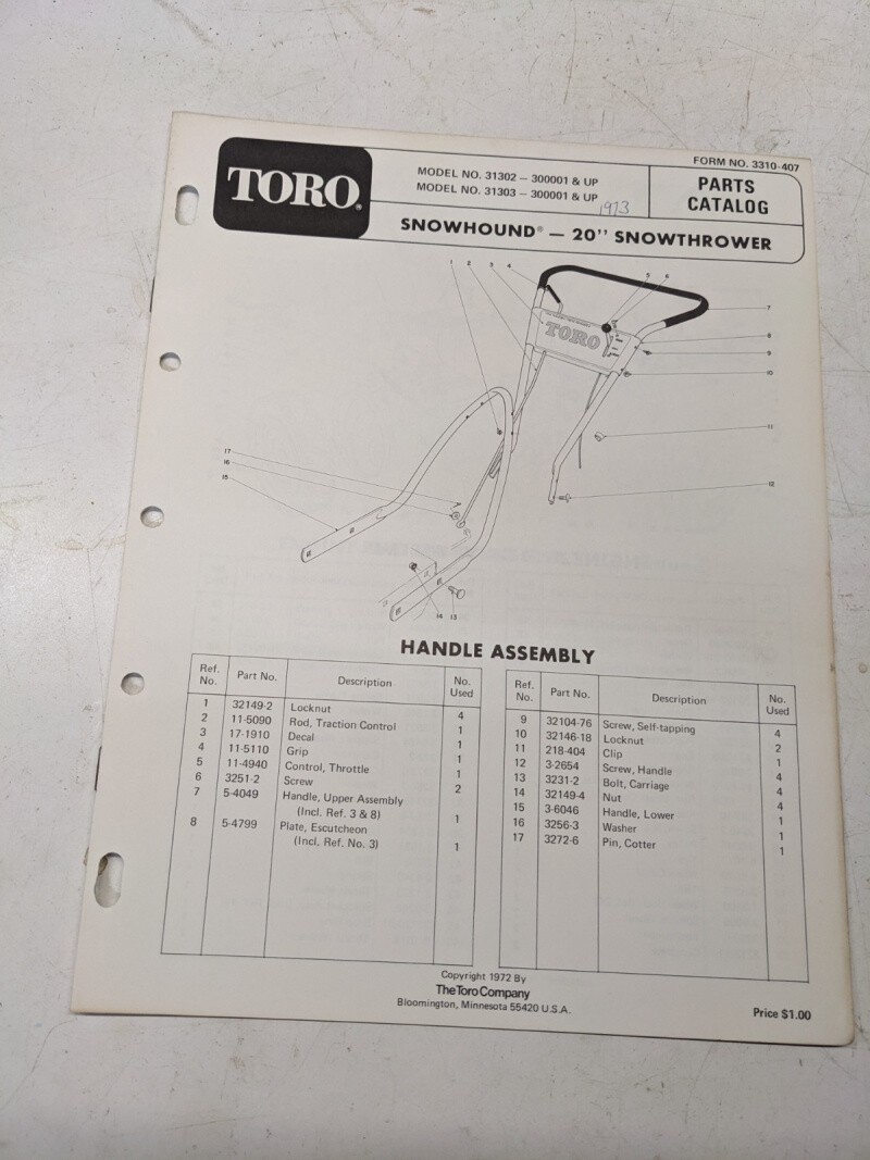Toro Parts Catalog List Book Manual Snow Hound 20” 31302 31303 1972 Blower