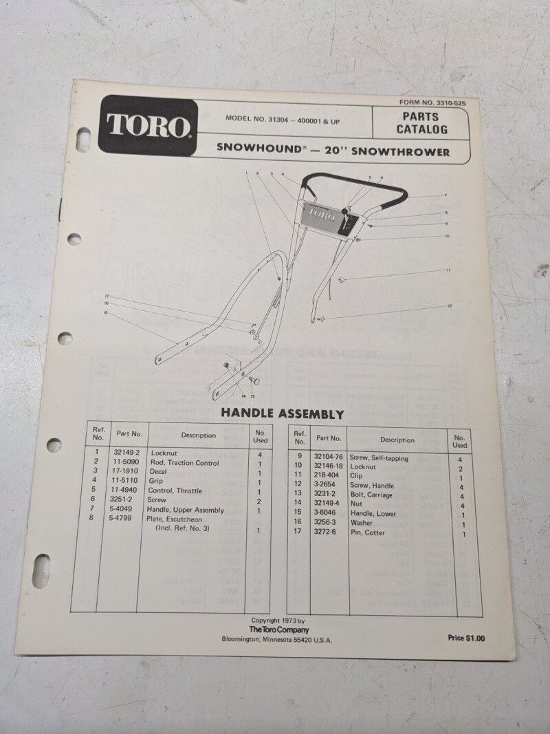 Toro Parts Catalog List Book Manual Snow Hound 20” 31304 1973 Blower 3310-525