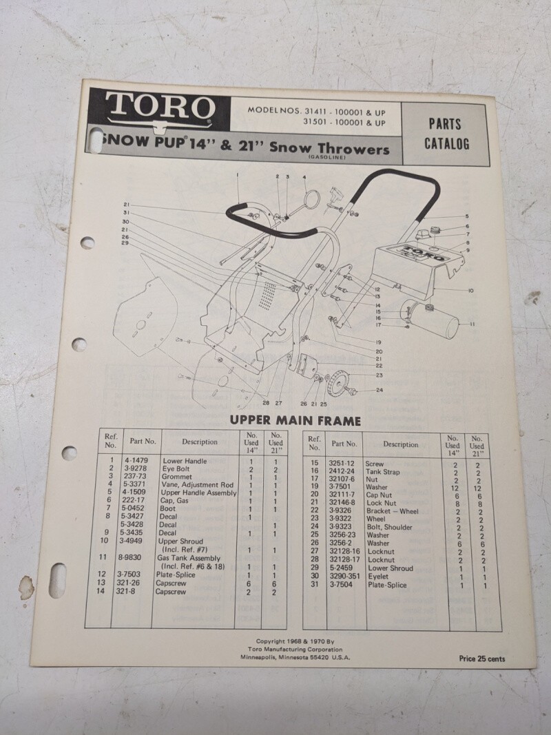 Toro Parts Catalog List Book Manual Snow Thrower Blower 14 21” 31411 31501 1970