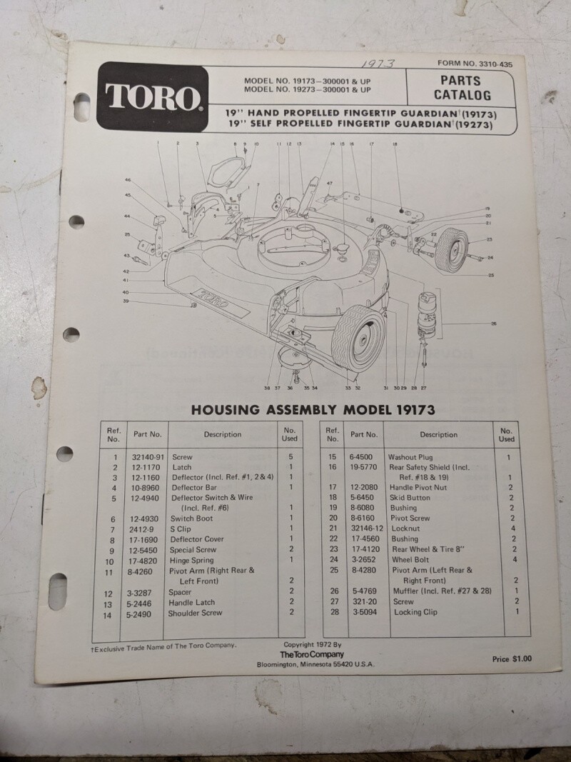 Toro Parts Catalog List Manual Book 19” Guardian Hp Sp 19173 19273 1972 Mower