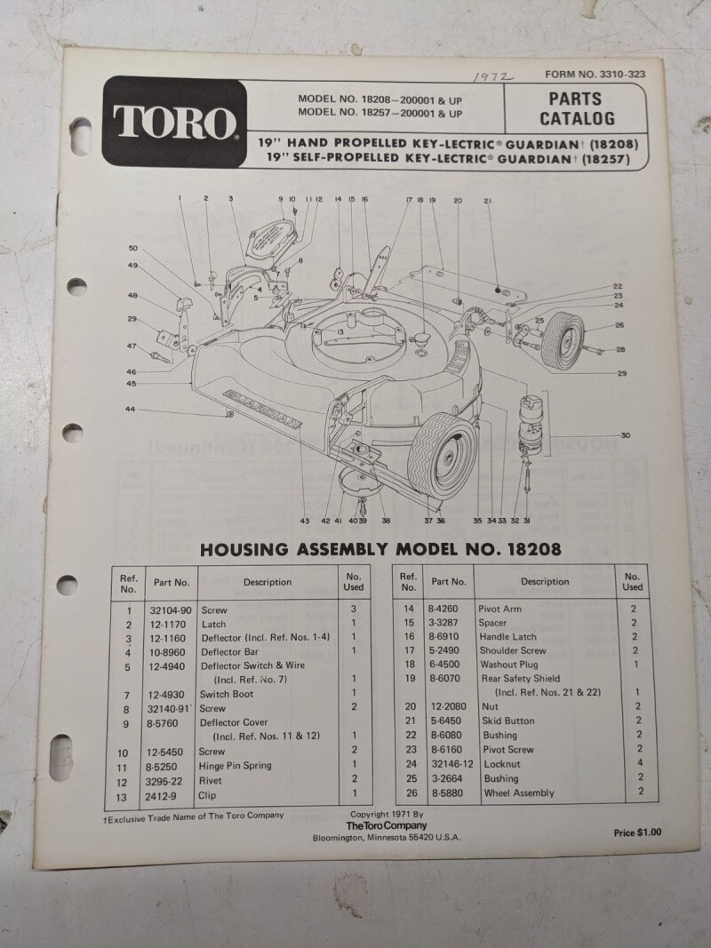 Toro Parts Catalog List Manual Book 19” Guardian Keylectric 18208 18257 1971