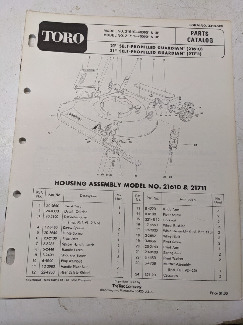 Toro Parts Catalog List Manual Book 21” Guardian Sp 21610 21711 1973 Mower