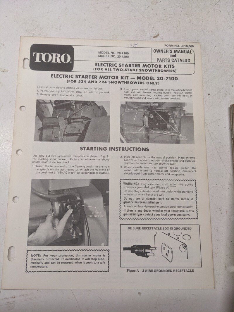 Toro Parts Catalog List Manual Owner Electric Starter Motor Kit 20-7100 7200
