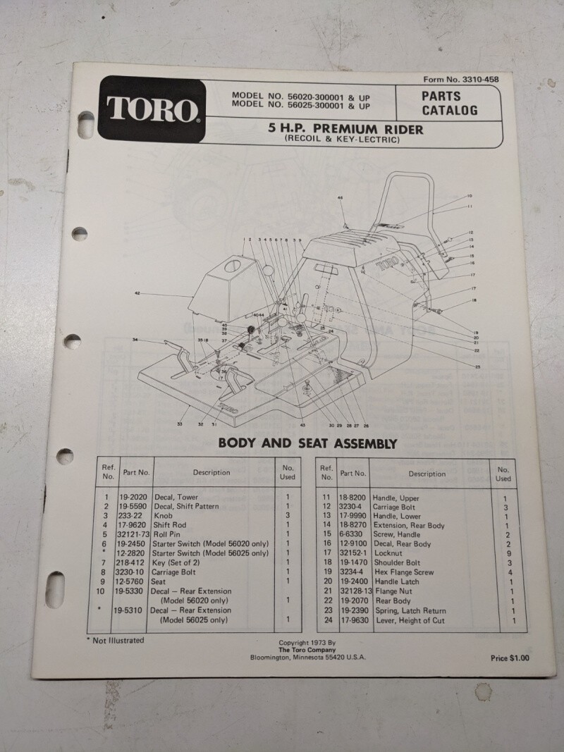 Toro Premium Rider Parts Catalog List Manual 5Hp Lawn Tractor 56020 56025 1973