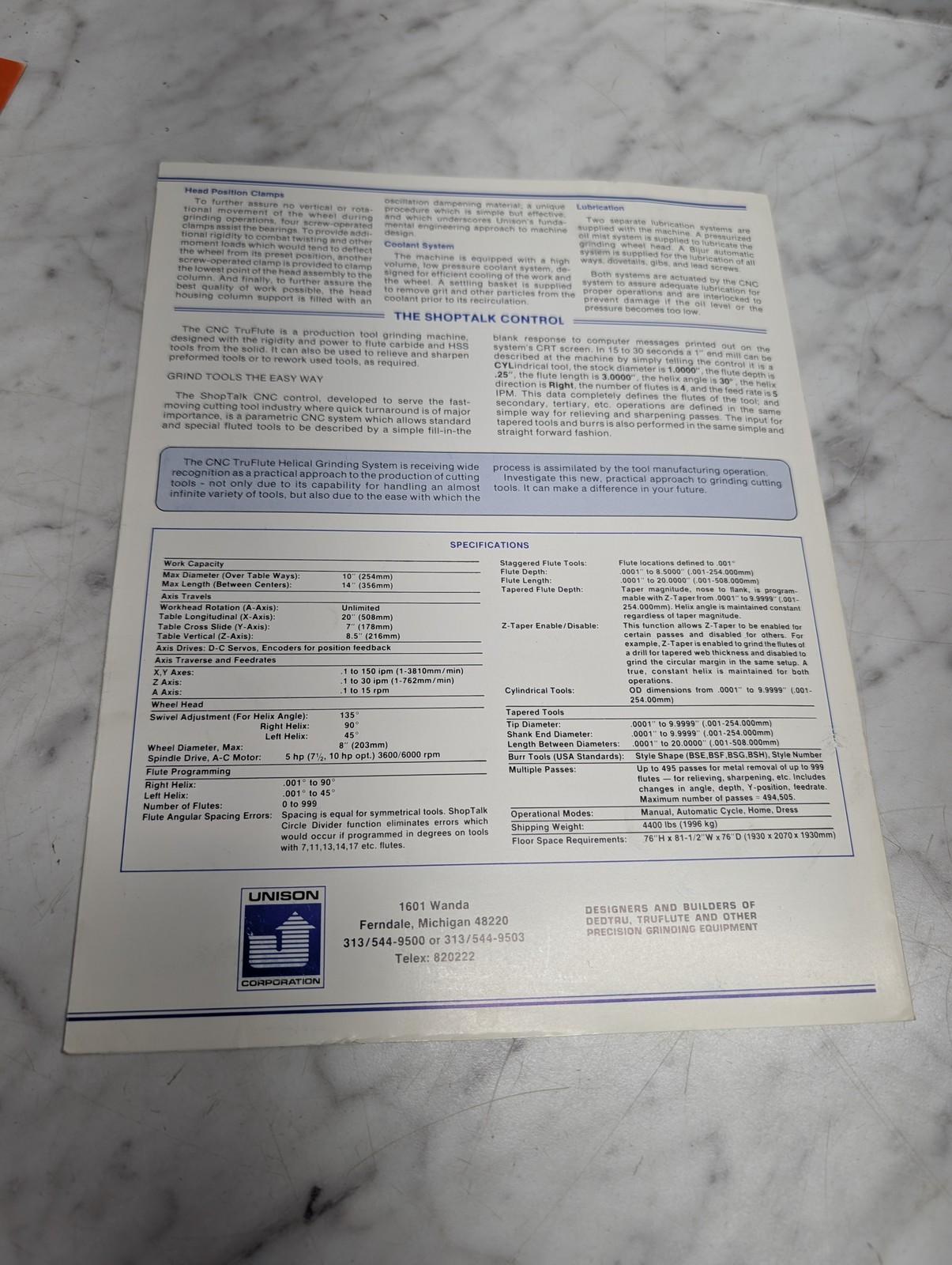 Unison Model 608 Cnc Truflute Four Axis Helical Grinding System Sales Brochure