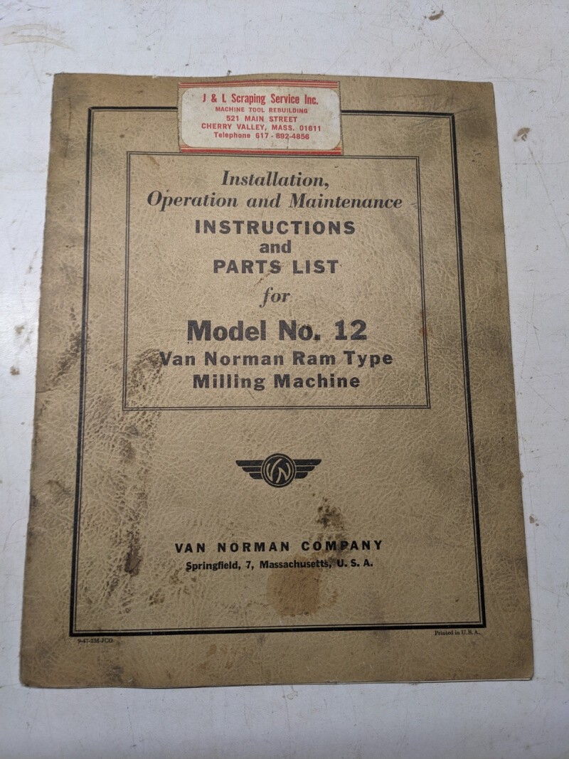 Van Norman Milling Machine Operator Service Manual Part List Model #12 Shop 1947