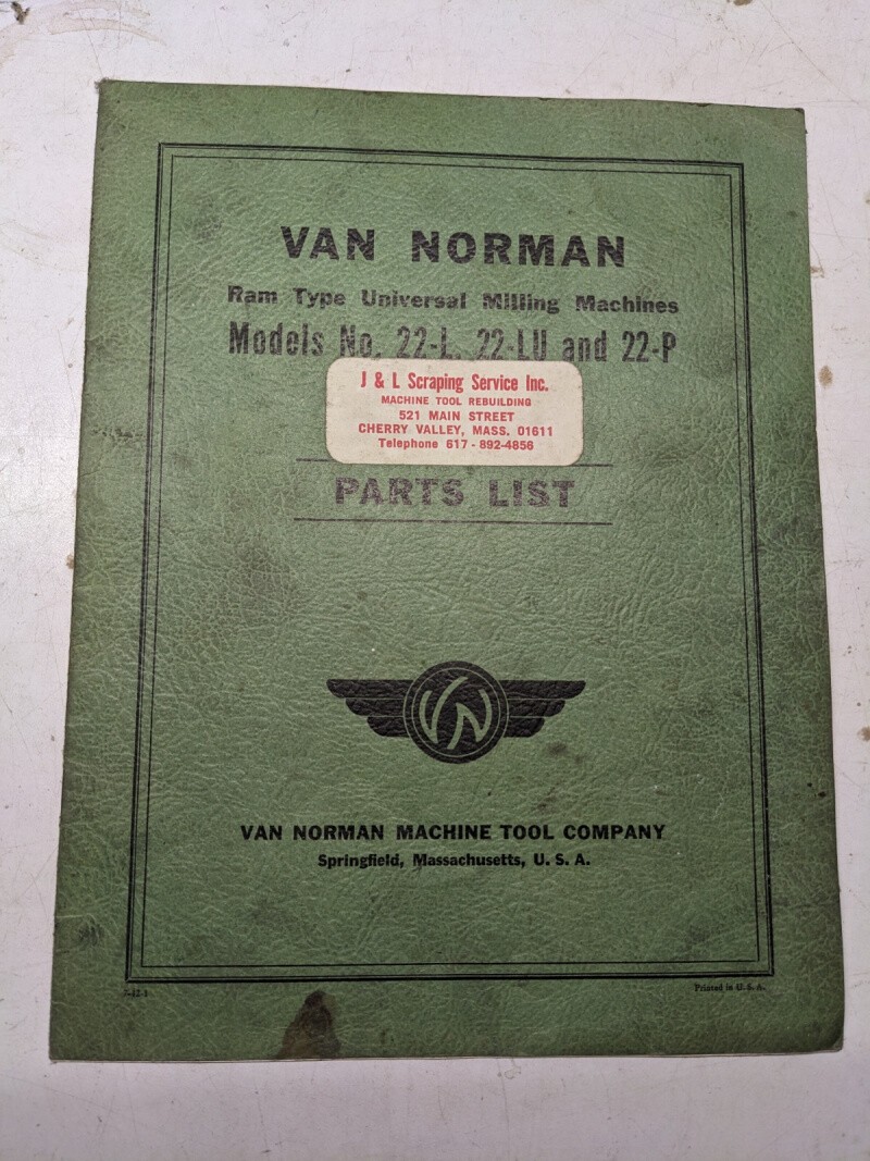 Van Norman Milling Machine Service Part List Catalog Manual Model 22-L Lu P 1942