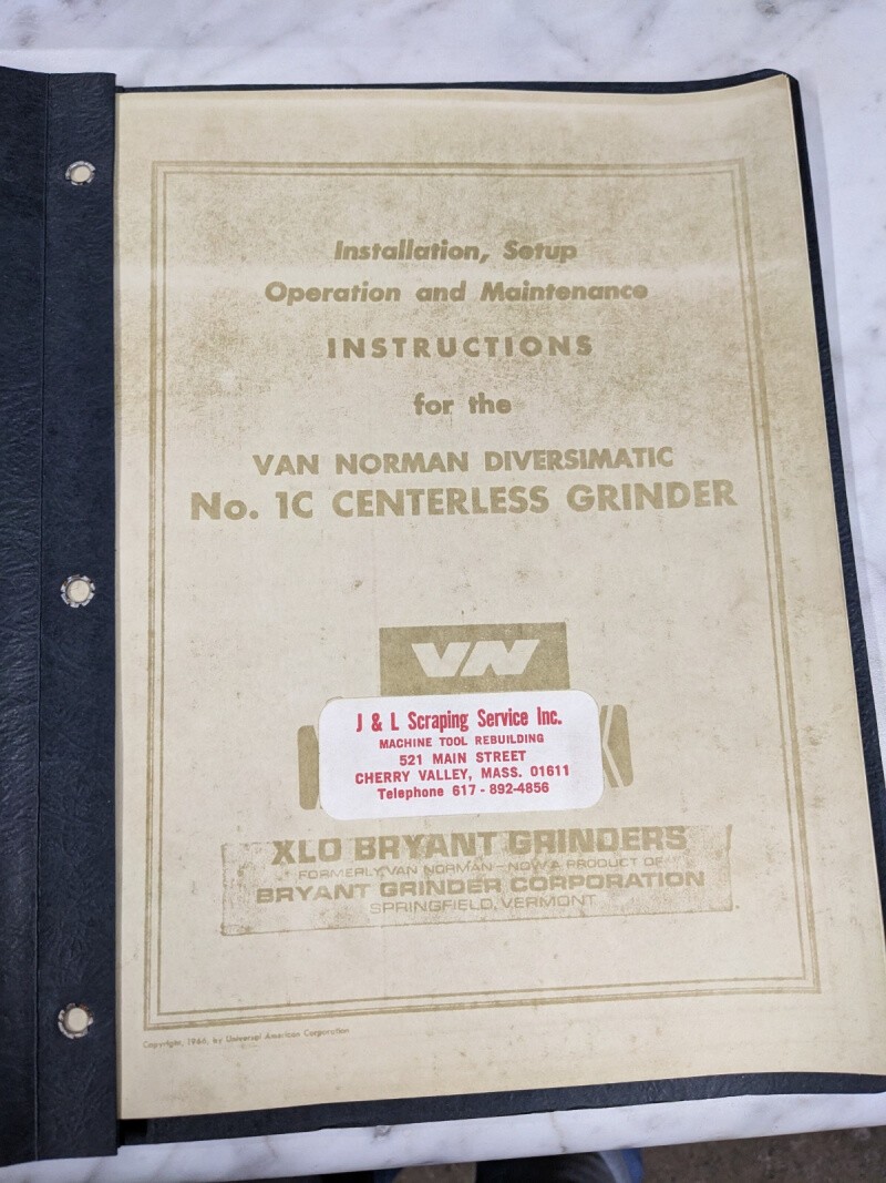 Van Norman Operator Service Manual 1C Centerless Grinder Machine Parts List Book