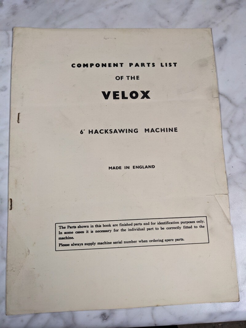 Velox 6” Hacksawing Machine Component Service Parts List Manual Catalog Shop Saw