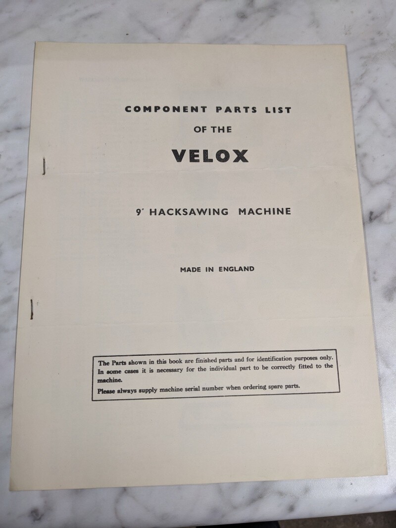 Velox 9” Hacksawing Machine Component Service Parts List Book Manual Catalog