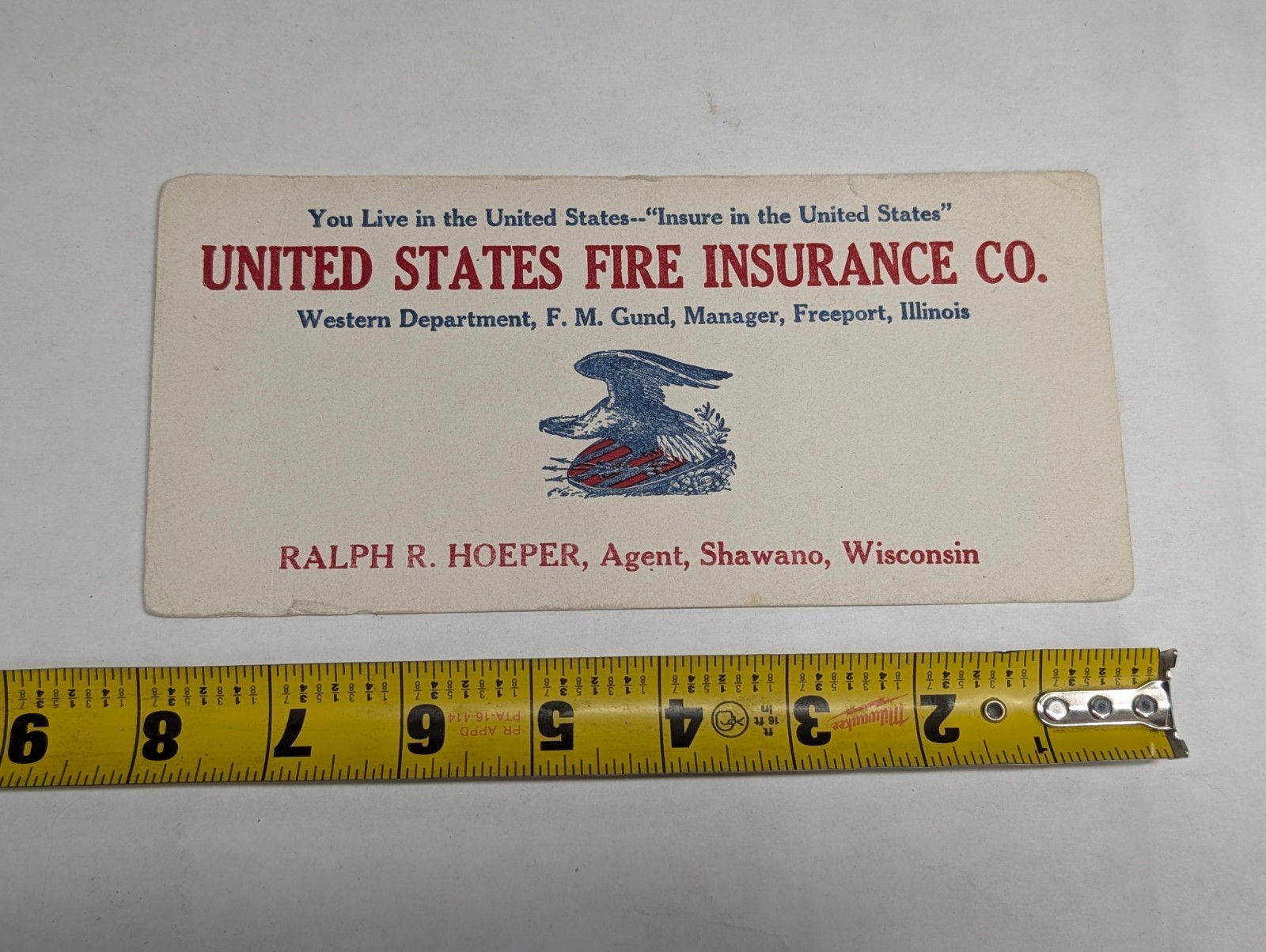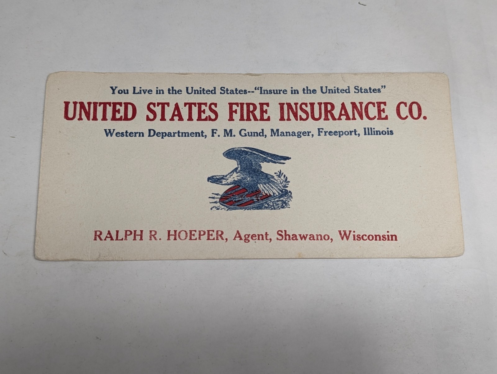 Vintage United State Fire Insurance Company Agent Card Shawano Wisconsin Ralph