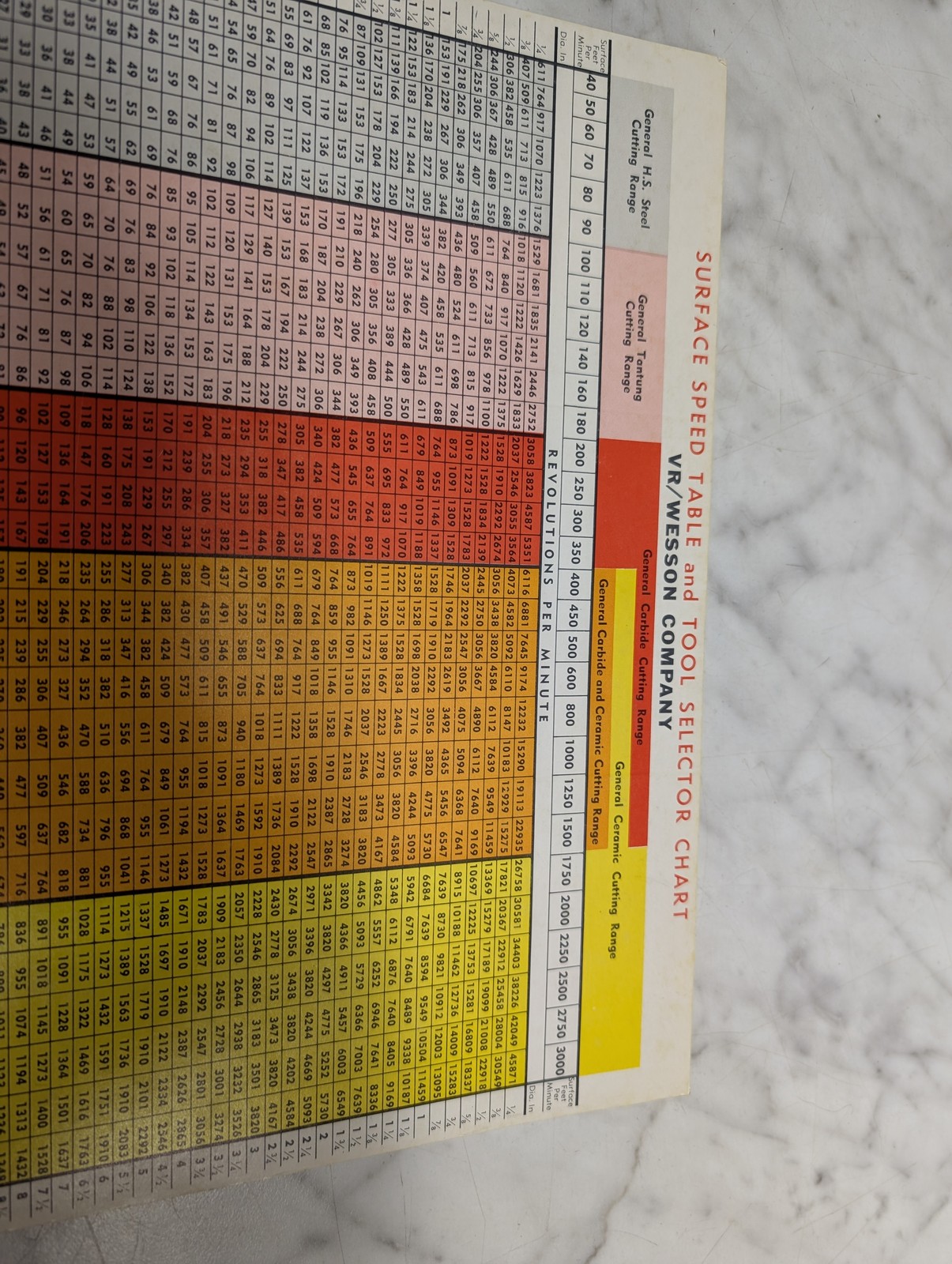 Vr Wesson Surface Speed Table Tool Selector Chart 1963
