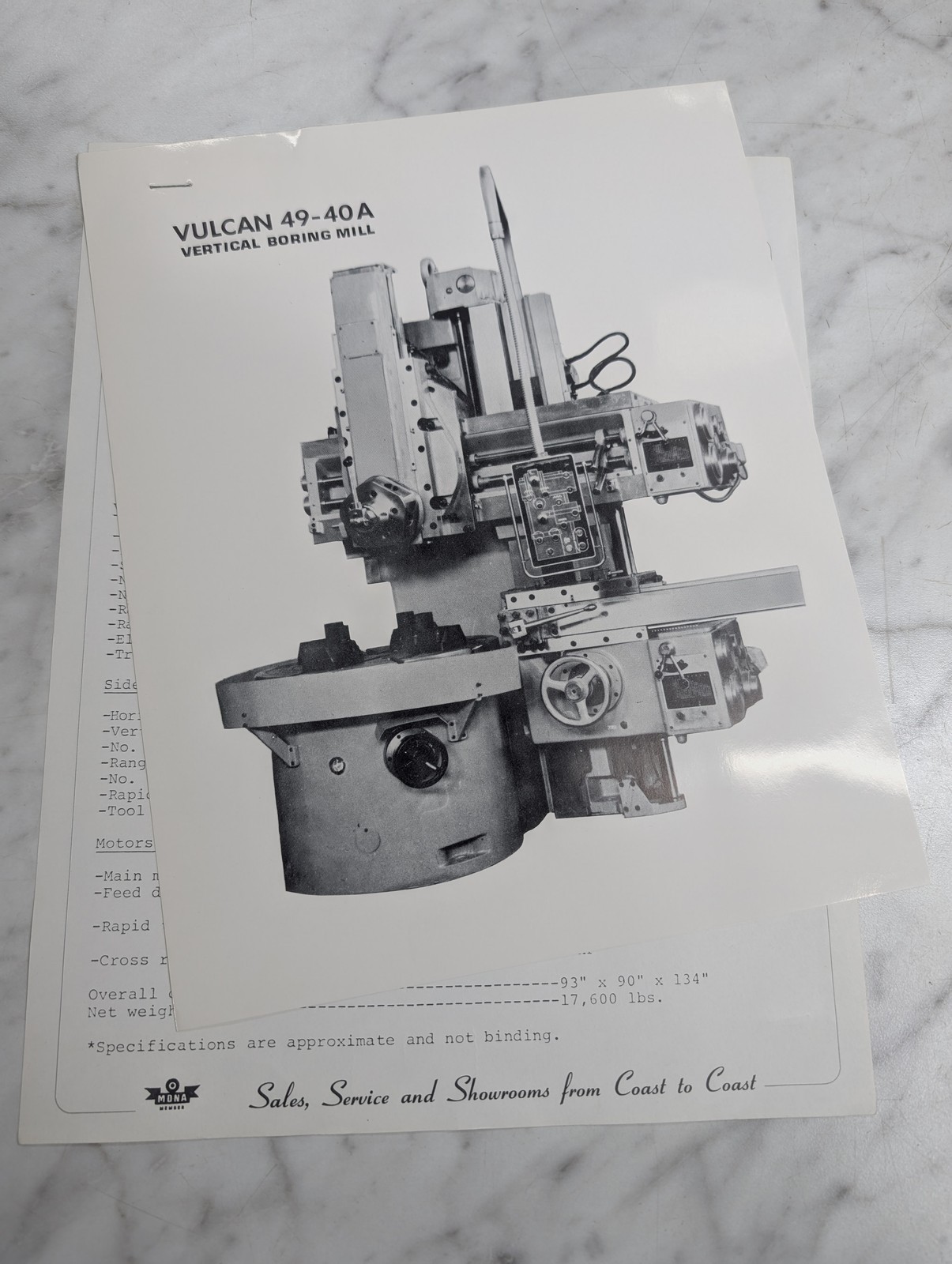 Vulcan 49-40A Vertical Boring Mill Sales Information Literature Brochure Specs