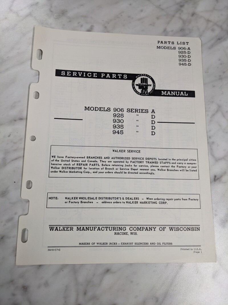 Walker Manufacturing Service Parts List Manual 906 925 930 945 A D 1957 Jack