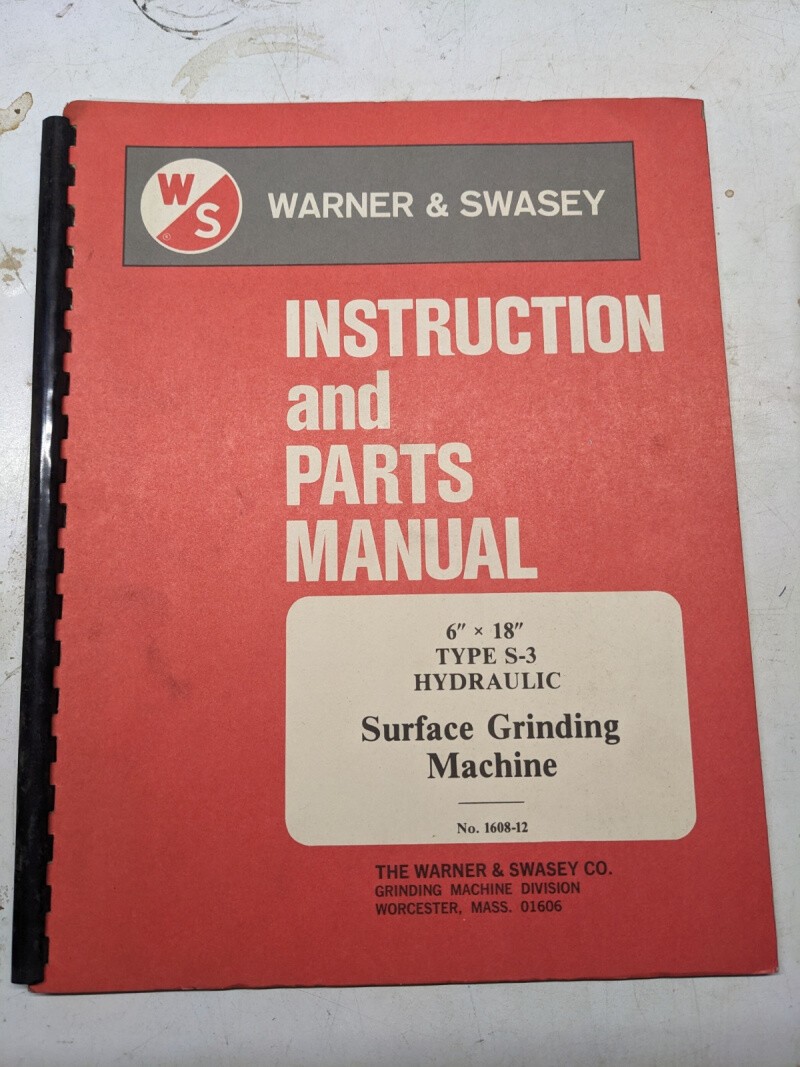 Warner Swasey Instruction Operator Parts List Manual Surface Grinding S-3 6X18”