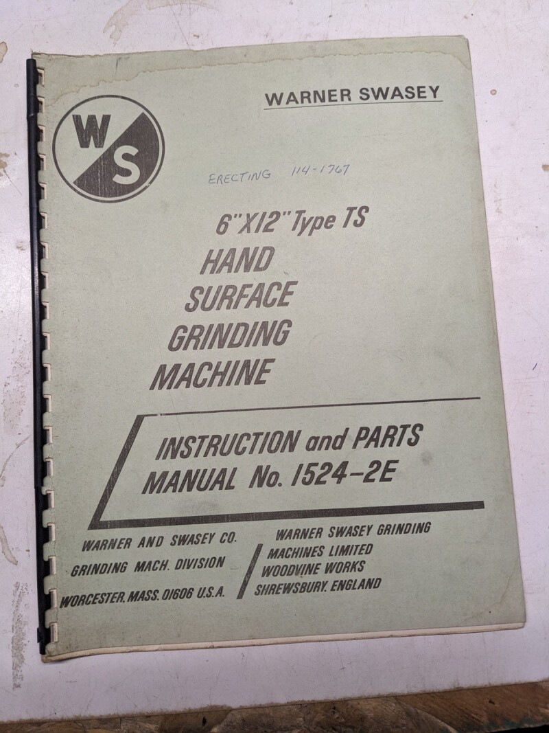 Warner Swasey Instruction Part List Manual Hand Surface Grind 6X12” 1524-2E Ts