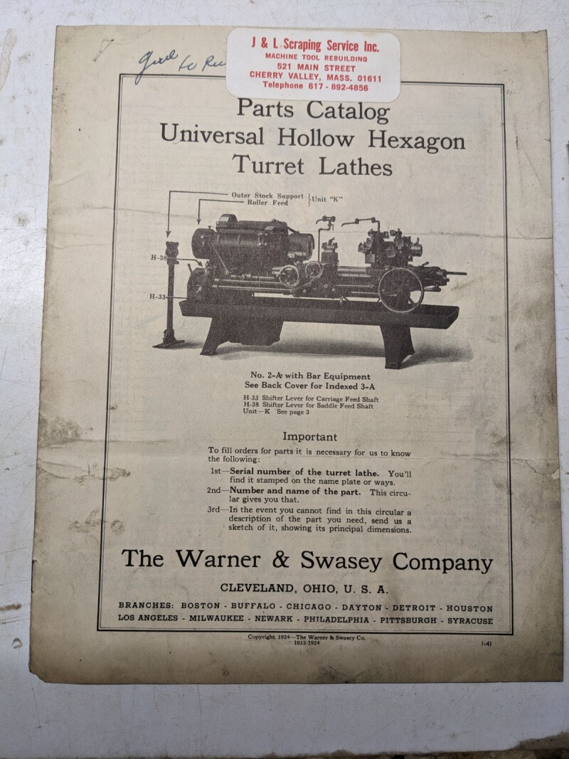 Warner Swasey Turret Lathe Repair Parts List Catalog Manual #2-A 3-A 1924 Shop