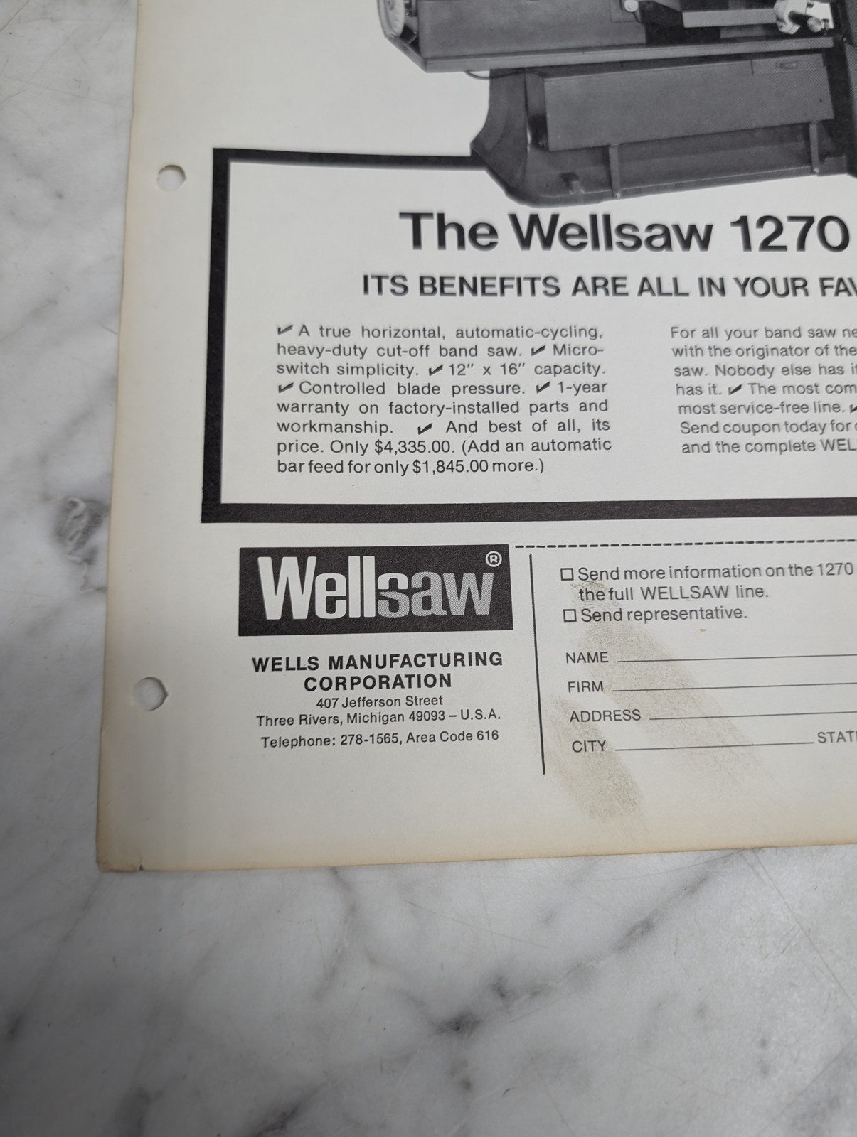 Wellsaw 1270 Sales Brochure Catalog Literature Specs Features Info Sales Sheet