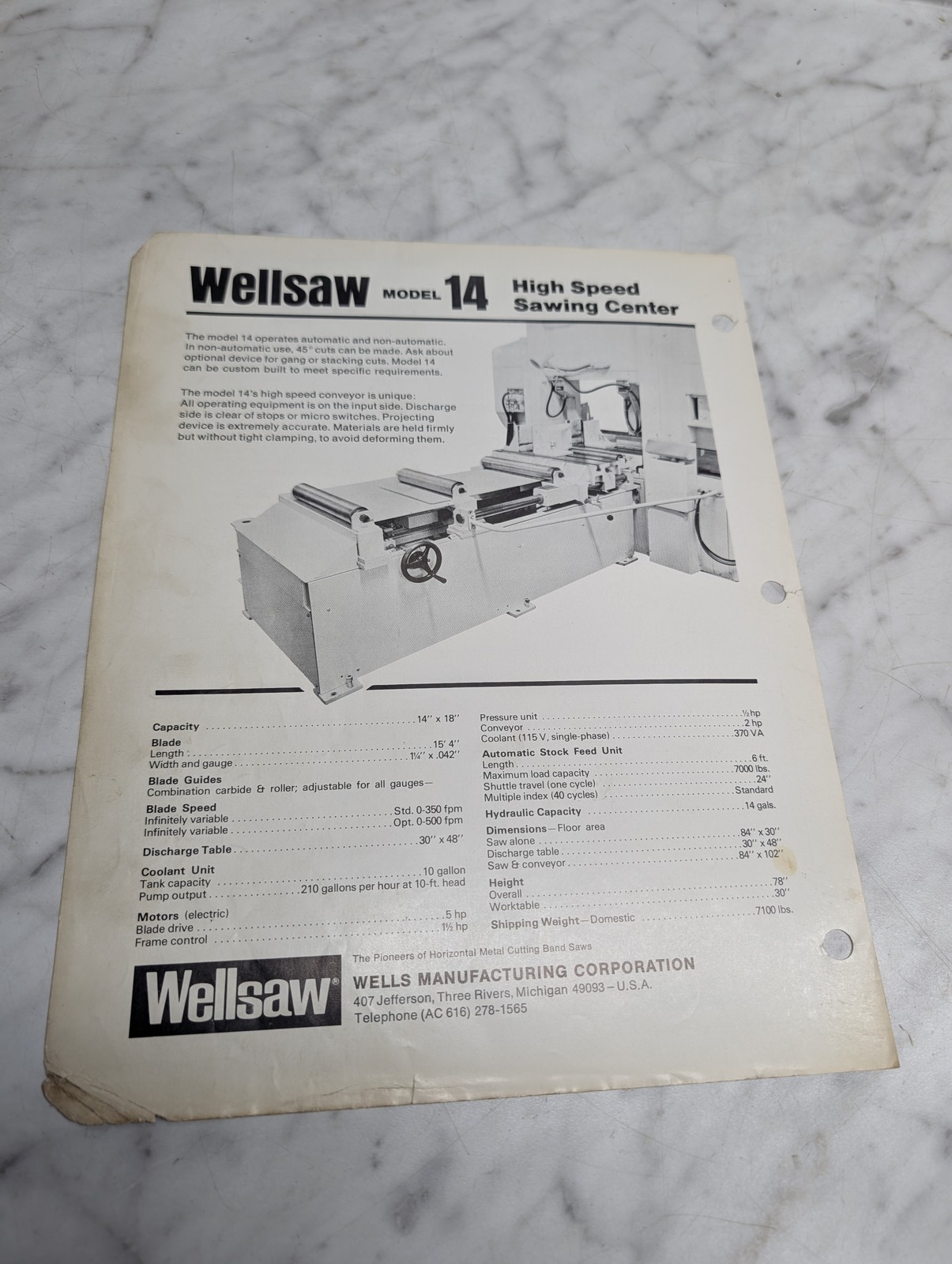 Wellsaw Model 14 High Speed Sawing Center New Catalog Literature Specs Info