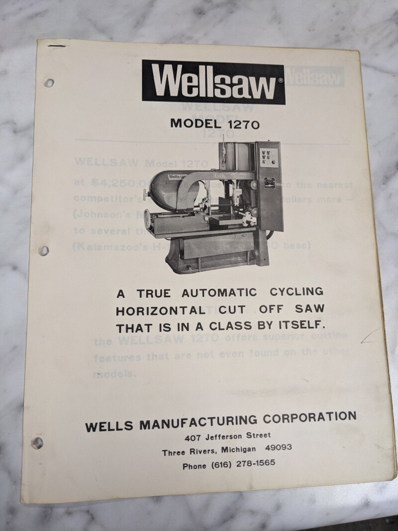 Wellsaw Sales Brochure Features Price Model #1270 Auto Cut Off Saw Machine