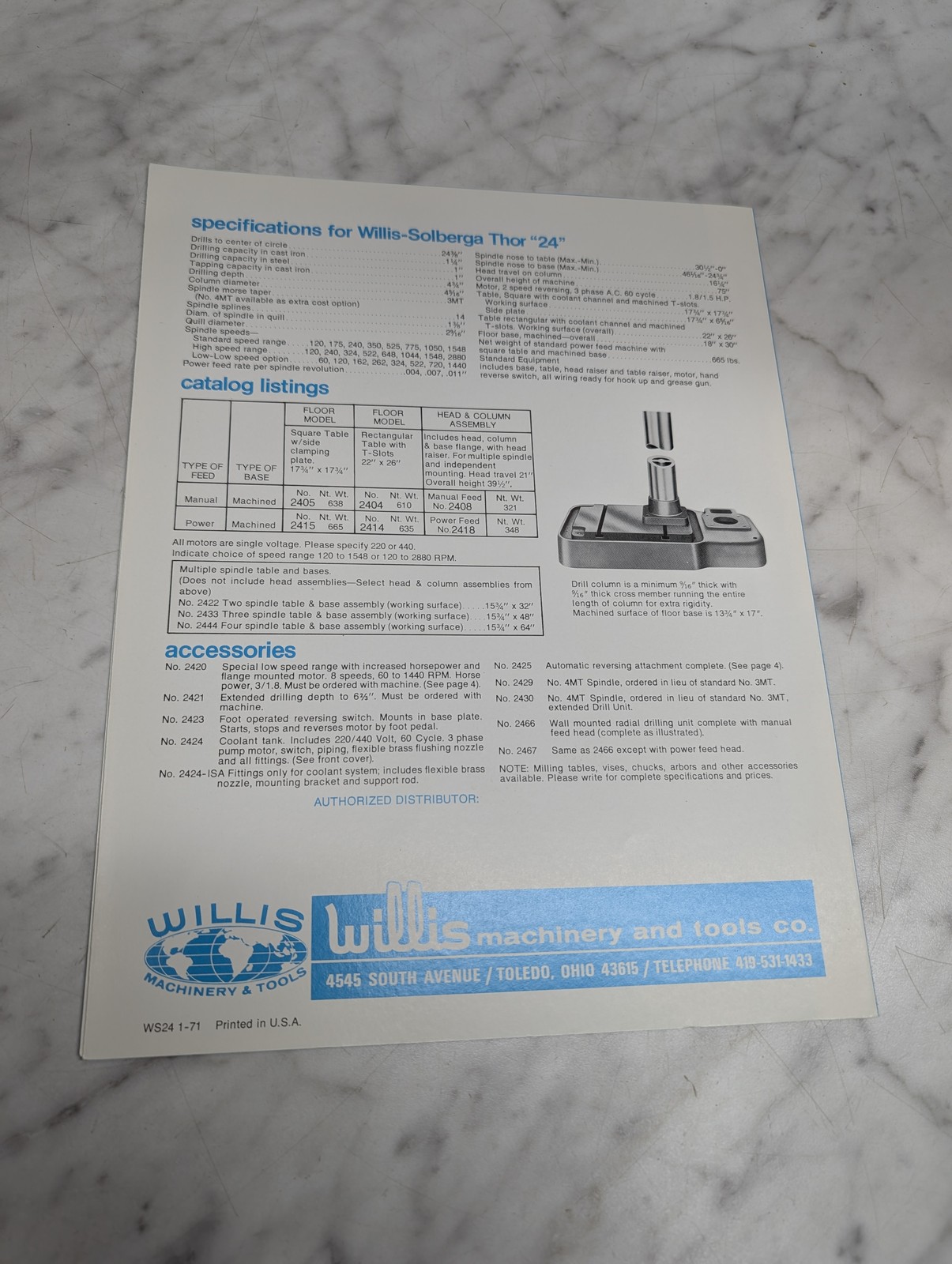 Willis Solberga Thor 24 Direct Gear Drive Drill Press Model No 2405 Brochure