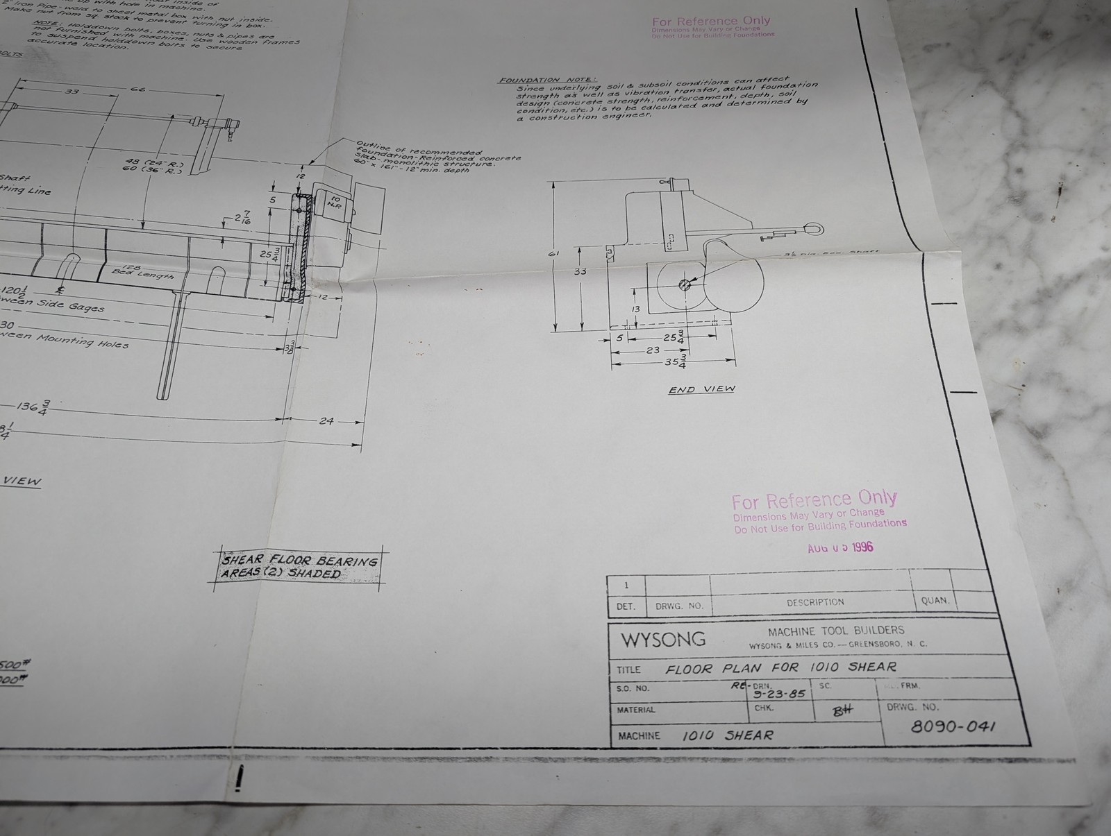 Wysong 1010 Shear Machine Tool Floor Plan Drawing Print 8090-041 1985