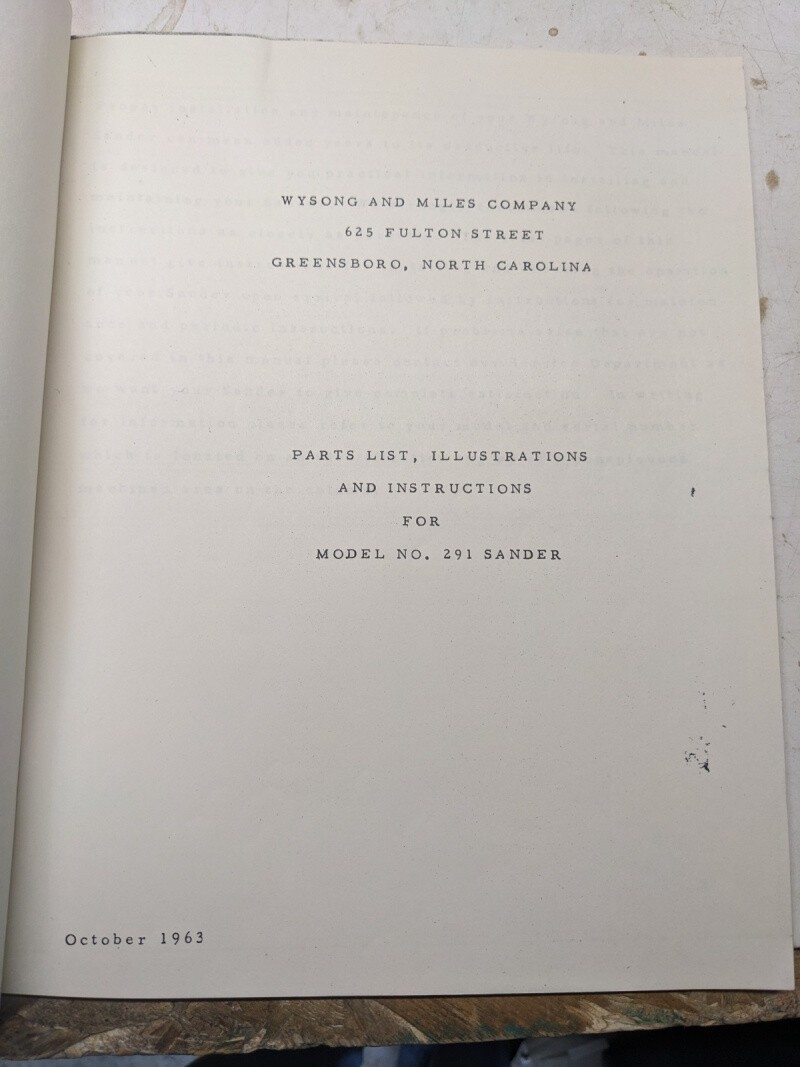 Wysong Miles Operator Instruction Service Parts List Book Manual #291 Sander