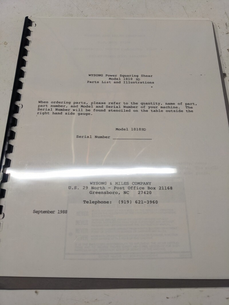 Wysong Parts List Book Manual Power Squaring Shears 1010 Rd 1988