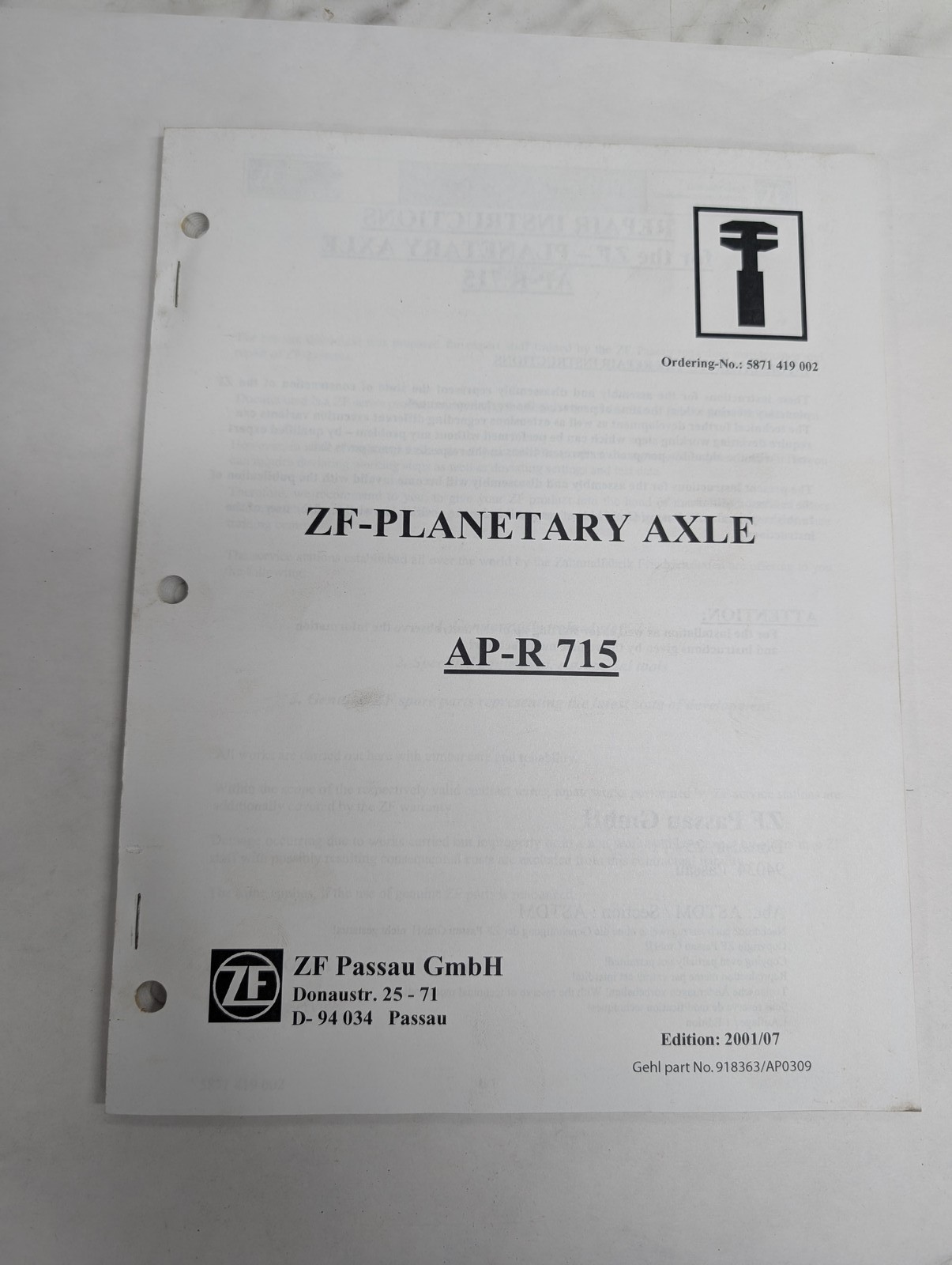 Zf Passau Gmbh Zf-Planetary Axle Ap-R 715 Gehl #918363/Ap0309 Service Manual